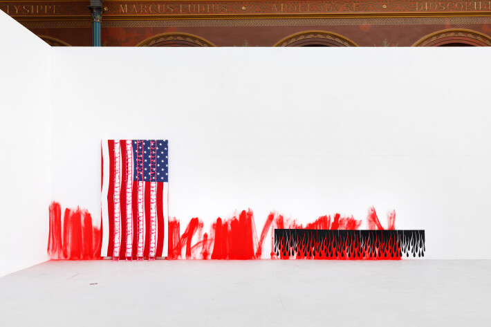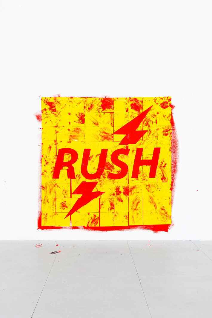 In his paintings and installations, Romain Jaccoud takes up symbols and signs from mass media and pop culture in a playful manner, reducing, abstracting and combining them. Romain's works often grow beyond the pictorial surface, which dissolves, hangs down or is broken through. References to everyday imagery that contribute to society’s sensory overload can be found everywhere. We see flags, smileys, company logos or abstract flames fighting for space on the canvas in a «war of symbols». In a «dangerous game», according to Romain, all these elements are rearranged to create a metaphorical yet real house of cards. Its structure could collapse at any moment, exposing the constructed nature of the reign of signs.